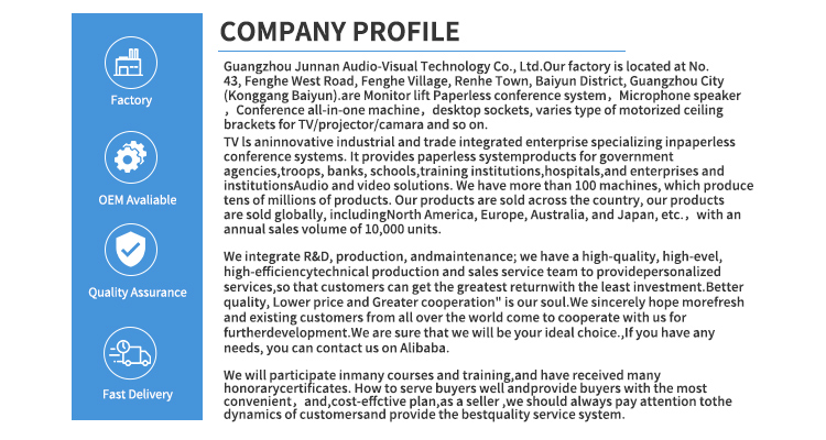 تعتبر شاشات الرفع لشاشات LCD لشاشات OLED الكهربائية المتقدمة مناسبة لجميع أنواع المشاهد، ولدينا تكنولوجيا القطع بآلة CNC وتكنولوجيا الليزر، وأحدث تكنولوجيا لرافع شاشات LCD لطاولات الاجتماعات لضمان أن المنتج يتمتع بمعايير عالية جدًا. تنتمي جميع شاشات LCD لشاشات OLED الخاصة بنا إلى صنع في الصين ، وهي متاحة للشراء بالجملة ، ويمكن تخصيصها بشكل خاص للعملاء ، ولديها ما يكفي من رافع شاشات الكريستال السائل الكهربائية التي تعمل باللمس في المخزون لدعم التسليم السريع للعملاء. ومعدات junnan لدينا لديها مجموعة متنوعة من شهادات الشهادات مثل CCC، شهادة CE، ROHS، شهادة ISO، المنتج آمن وعالي الجودة، مع مؤهل التصدير، هو مصنع مباشر بسعر مناسب، لديه مصنع خاص به ويعمل لسنوات عديدة.